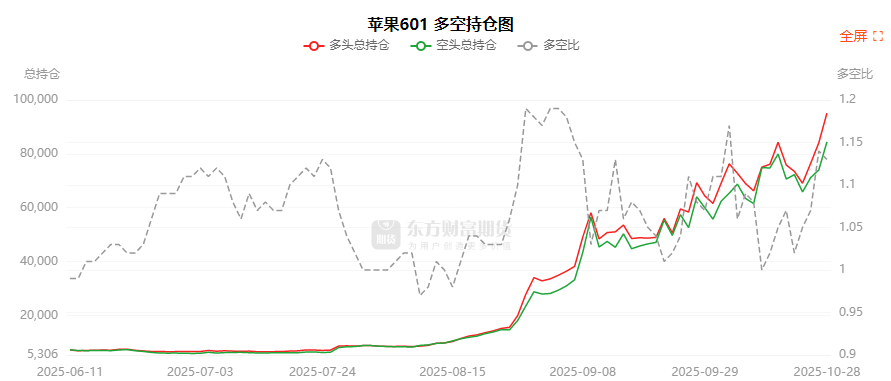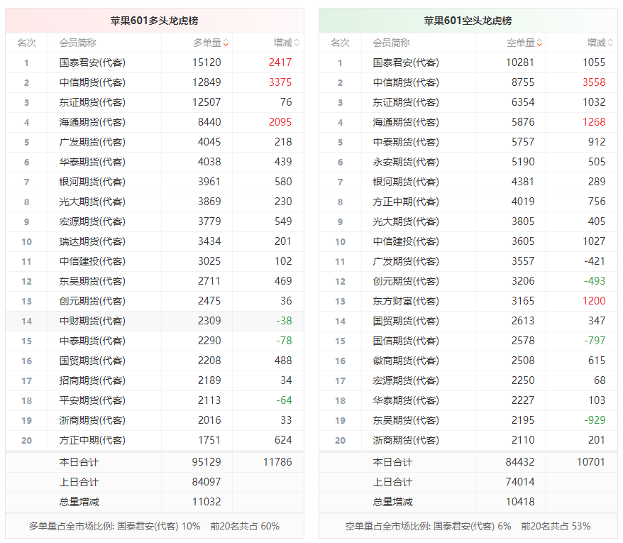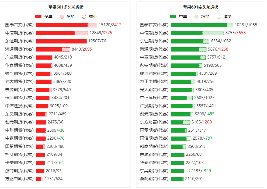 总体而言,苹果601合约今日增仓上行,多空持仓排名前20席中,多空双方均呈进场态势,多头进场意愿强于空头。