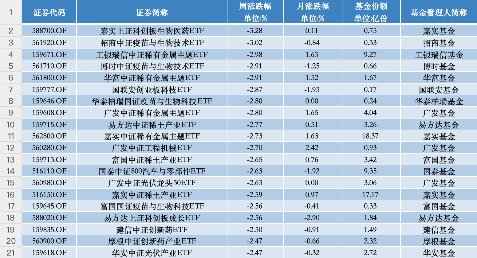 从周跌幅榜来看,科创生物医药ETF下跌3.28%,位居跌幅榜第一。其次是招商疫苗龙头ETF,周跌幅也超过3%。当然,过去三周,上述两只ETF都已经连涨了三周。