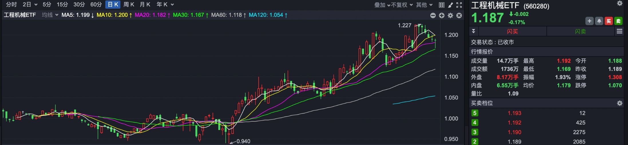 今年2月之后,工程机械ETF已经走出了趋势性行情,今年累计上涨近19%,短期调整之后,依旧值得继续逢低关注。