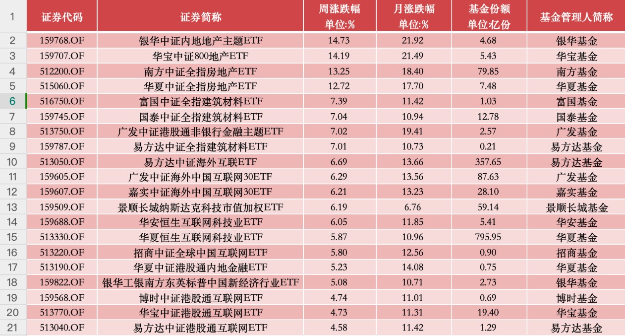 谁知,在他4月下旬割肉出局之后,随着地产政策利好“连发大招”,地产股本周迎来强劲反弹。地产相关ETF也成为本周表现最好的品种。